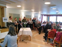 Matkattiin omalla bussilla koska lähtijöitä oli 28+kuski. Kuoro ja harmonikat esiintyivät kun juotiin kakkukahveja ja hieman siinä tanssittiinkin juhlan lopuksi. Kyllä Kuhmo-talo on upea juhlapaikka.